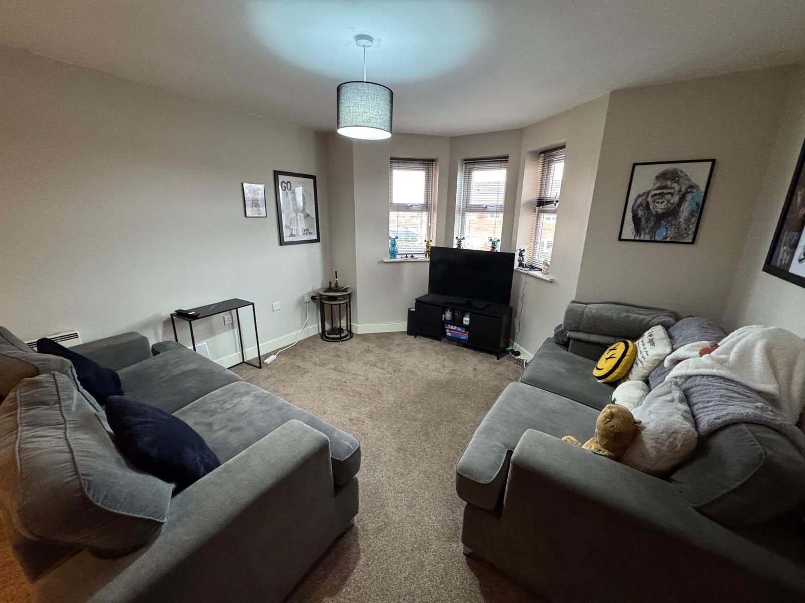 The apartment offers spacious and contemporary accommodation throughout. The bright lounge features a bay window, allowing plenty of natural light and creating a welcoming living space. The kitchen is modern and functional, while both bedrooms are well-proportioned doubles, ideal for sharers or couples. A modern bathroom, electric heating, and double glazing complete the interior.